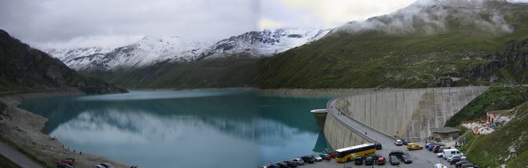 ![]() Le fameux barrage de Moiry 2300m. Au fond à droite, dans la neige, derière la crête, le Pas de Lona 2787m. |