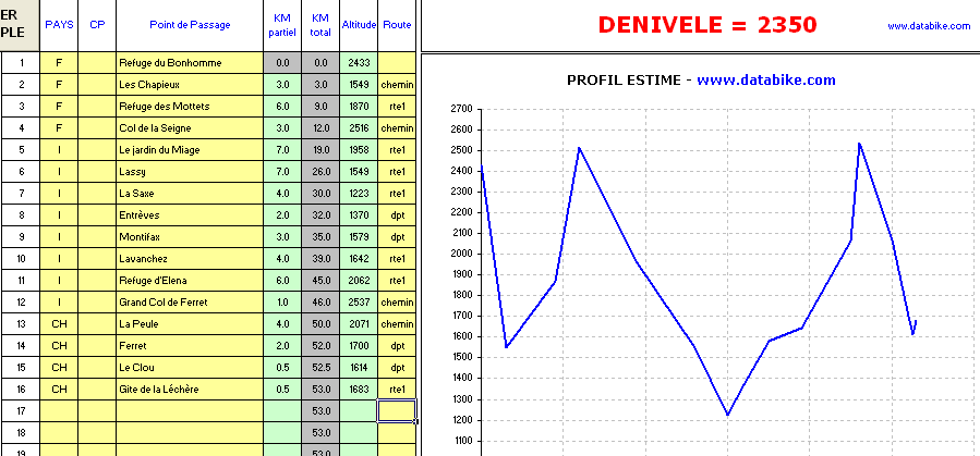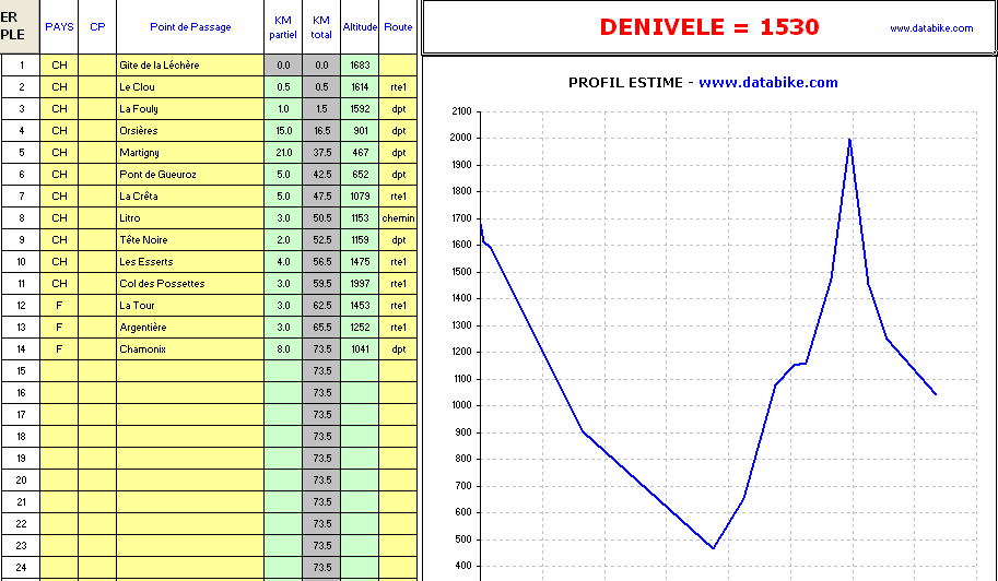 3ème jour, plus relaxe. Une variante et la descente du Val Ferret jusqu'en plaine à Martigny. 30km entre route départementale et forestière. De Martigny, direction la vallée du Trient. Magnifique gorge en direction du col des Mossettes, sur les hauts d'Argentière. Montée pédalage pur, parfois ardue, au sommet une des plus belle vue sur le Mont Blanc et la vallée de Chamonix. Retour à Cham' et au Gite Chamoniard. |