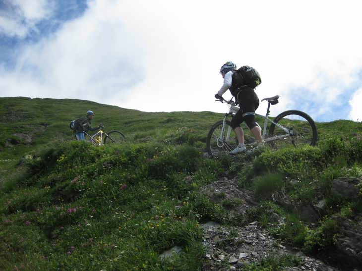 1er jour, une étape sympa pour une bonne mise en jambe en montant au col de Voza, puis une descente sur les Contamines. De là, ça monte jusqu'au col de la Croix du Bonhomme. Il faut pousser 2 heures le vtt pour arriver au sommet. On passe la nuit au refuge de la Croix du Bonhomme à 2433. |