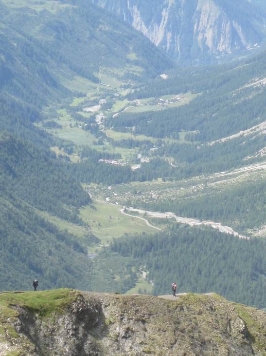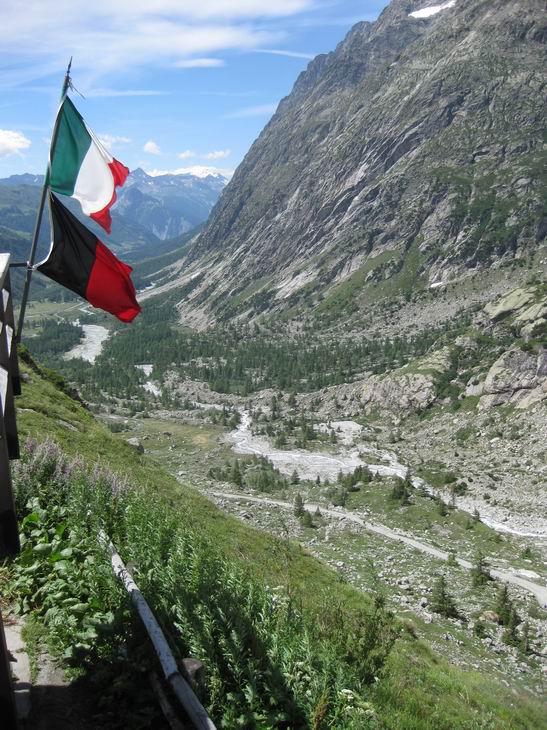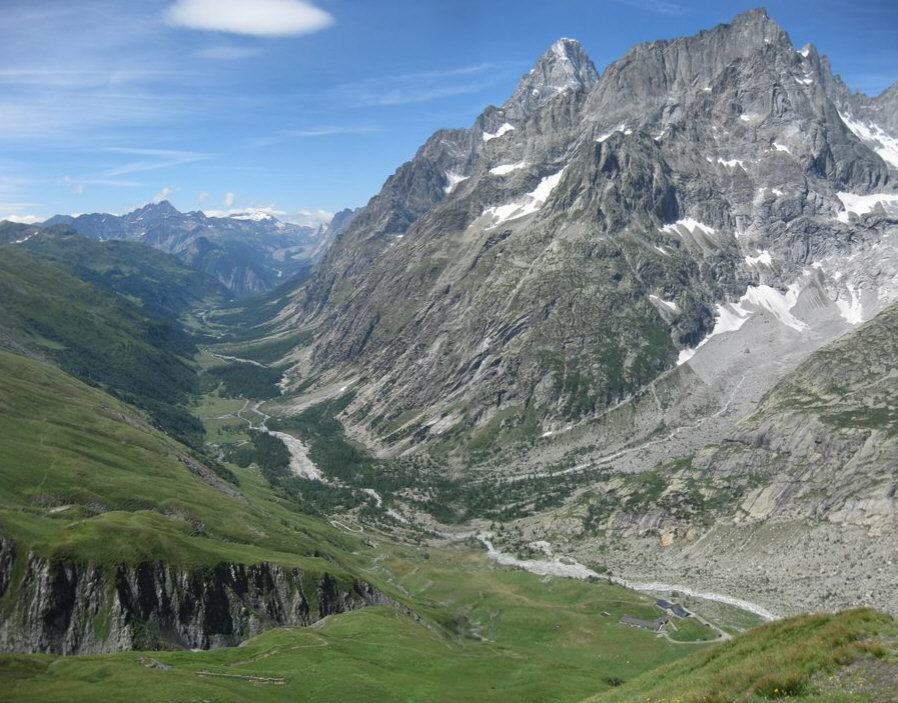 Vue du val Veny au fond et du val Ferret. Tout au fond de la vallée, le col de la Seigne. En fer à cheval le Jardin de Miage. Dans la vallée sur la gauche, Courmayeur. Au |